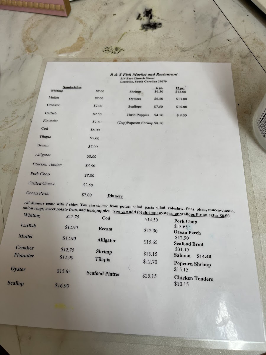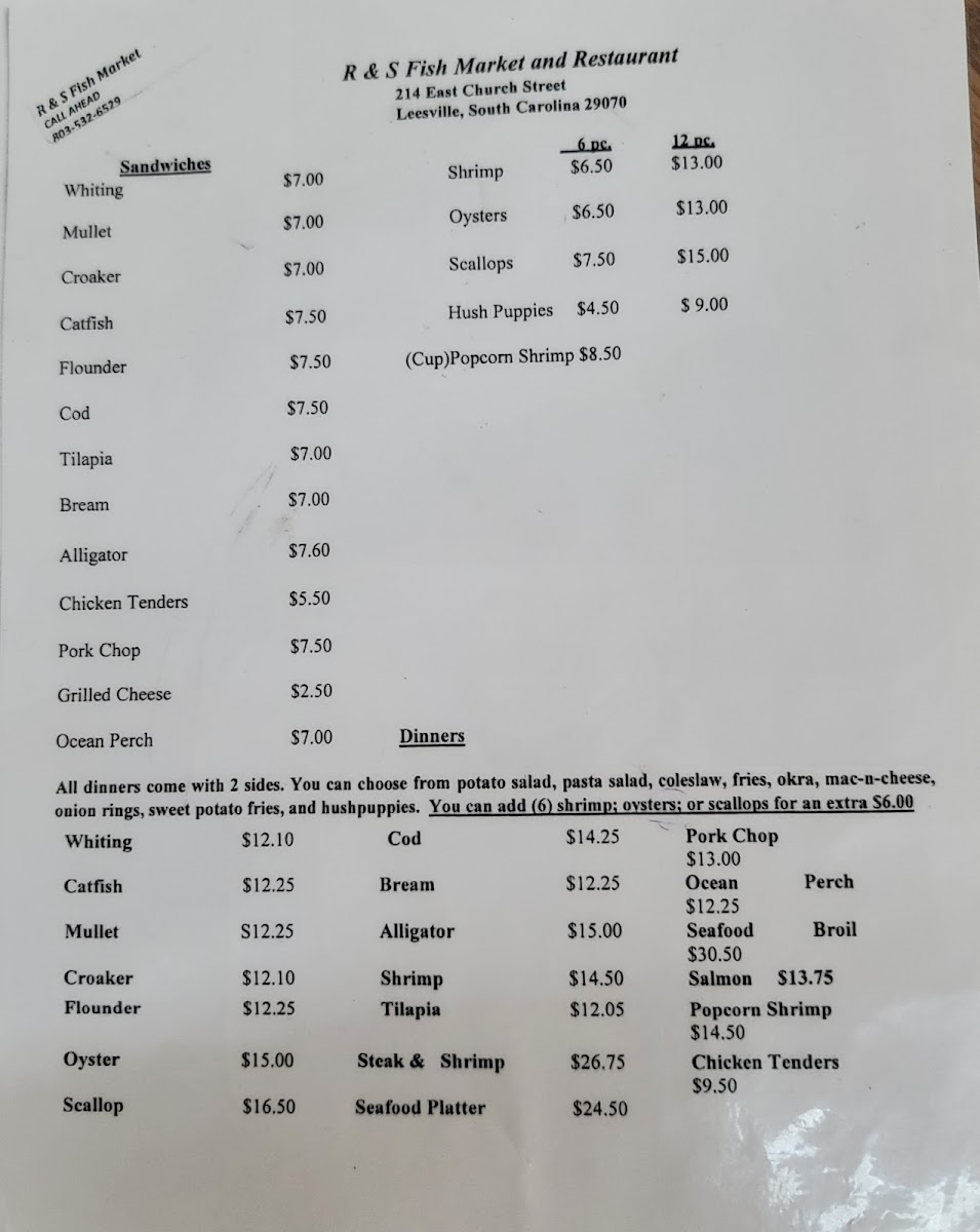 Looking for a satisfying seafood experience? R & S Fish Market & Restaurant Menu in Batesburg-Leesville offers a delightful variety of fresh, flavorful dishes that will satisfy your cravings. Located on E Church St, this charming spot specializes in high-quality seafood, served in a relaxed, welcoming atmosphere. Whether you’re in the mood for a hearty fish fry, succulent shrimp, or a light and crisp seafood salad, you’ll find something that hits the spot. With a menu that highlights local catches and classic seafood favorites, each dish is prepared with the freshest ingredients to ensure a truly memorable meal. From the daily specials to the crowd favorites, every option is crafted to bring the best flavors of the sea to your table. Whether you’re dining in or picking up, R & S Fish Market & Restaurant is the perfect place to enjoy a flavorful, seafood-packed meal with friends and family.
